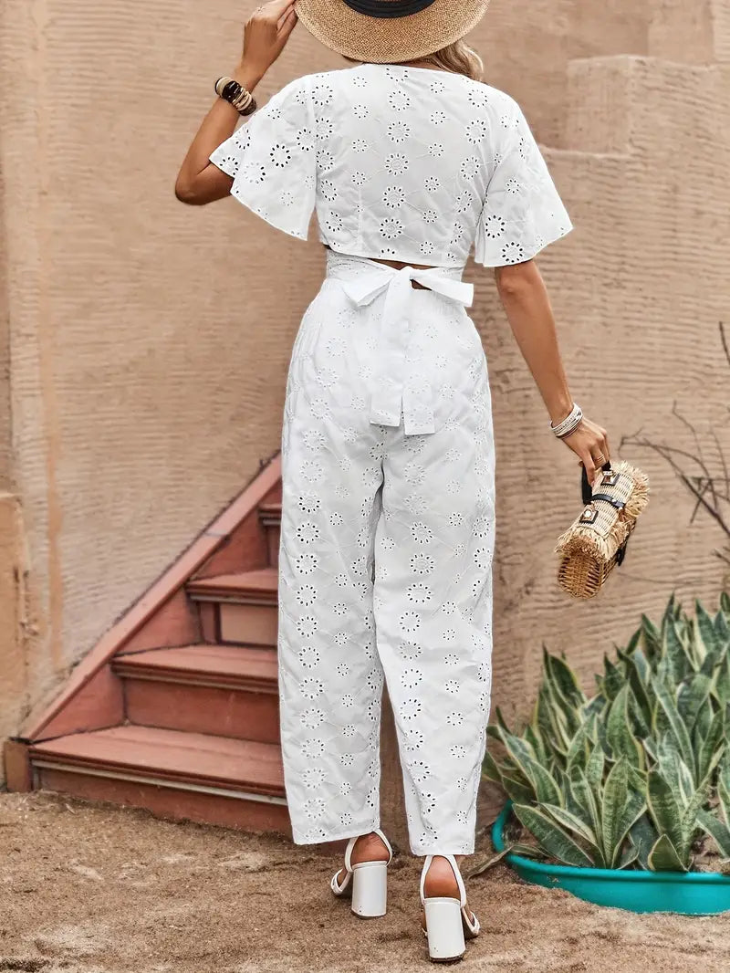 Les délicats œillets ajoutent une touche raffinée à la tenue, tandis que le design simple permet un style polyvalent. Ce tailleur-pantalon est idéal pour les journées chaudes, offrant une option à la fois aérienne et sophistiquée pour diverses occasions. Qu'il soit porté lors d'un dîner d'été ou d'une réunion entre amis, l'ensemble Valentine assure une présence élégante cette saison estivale.