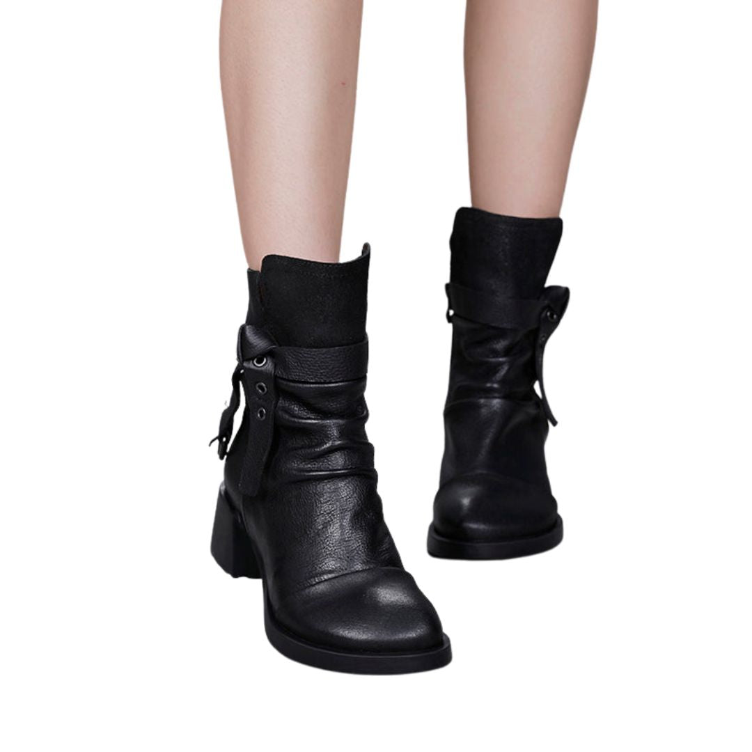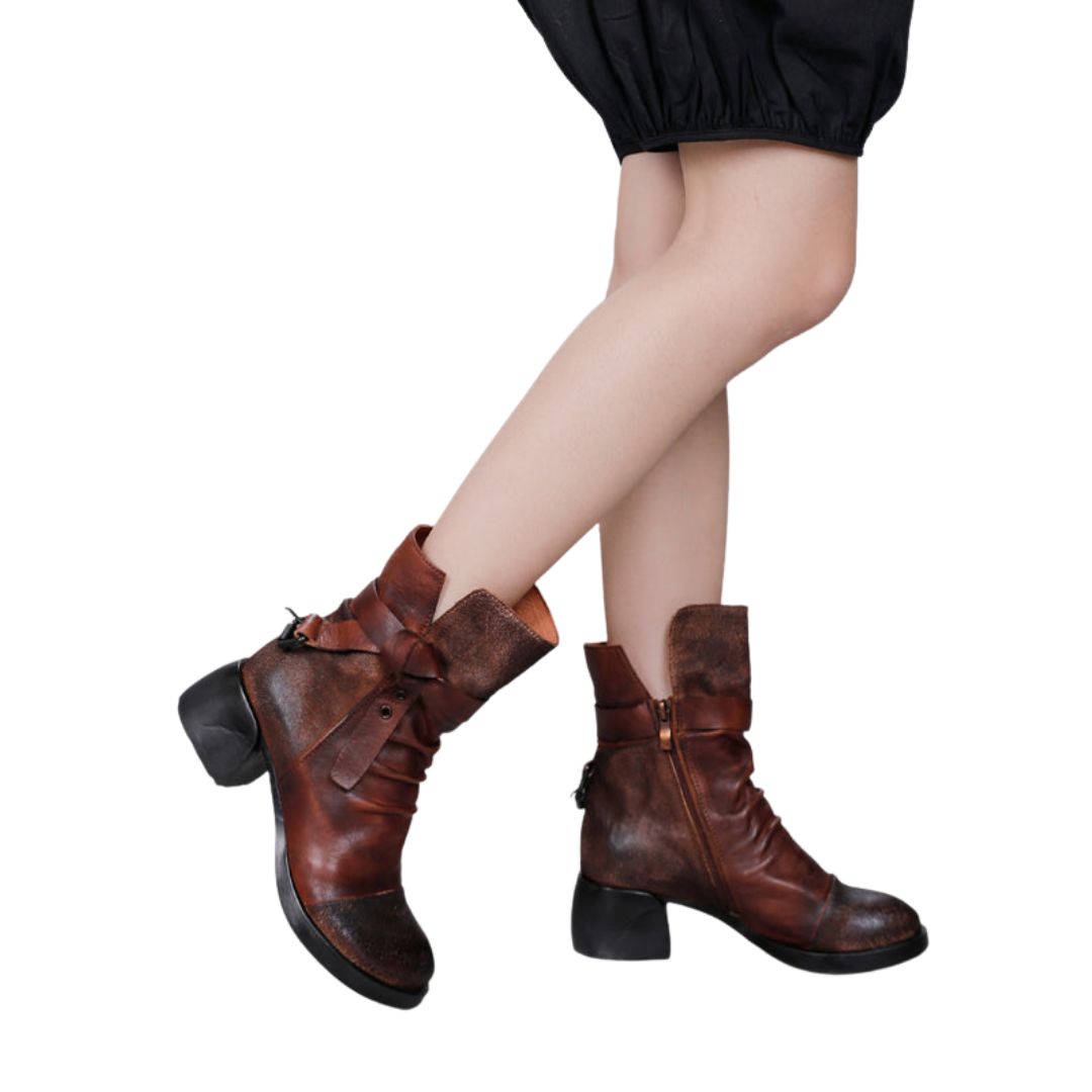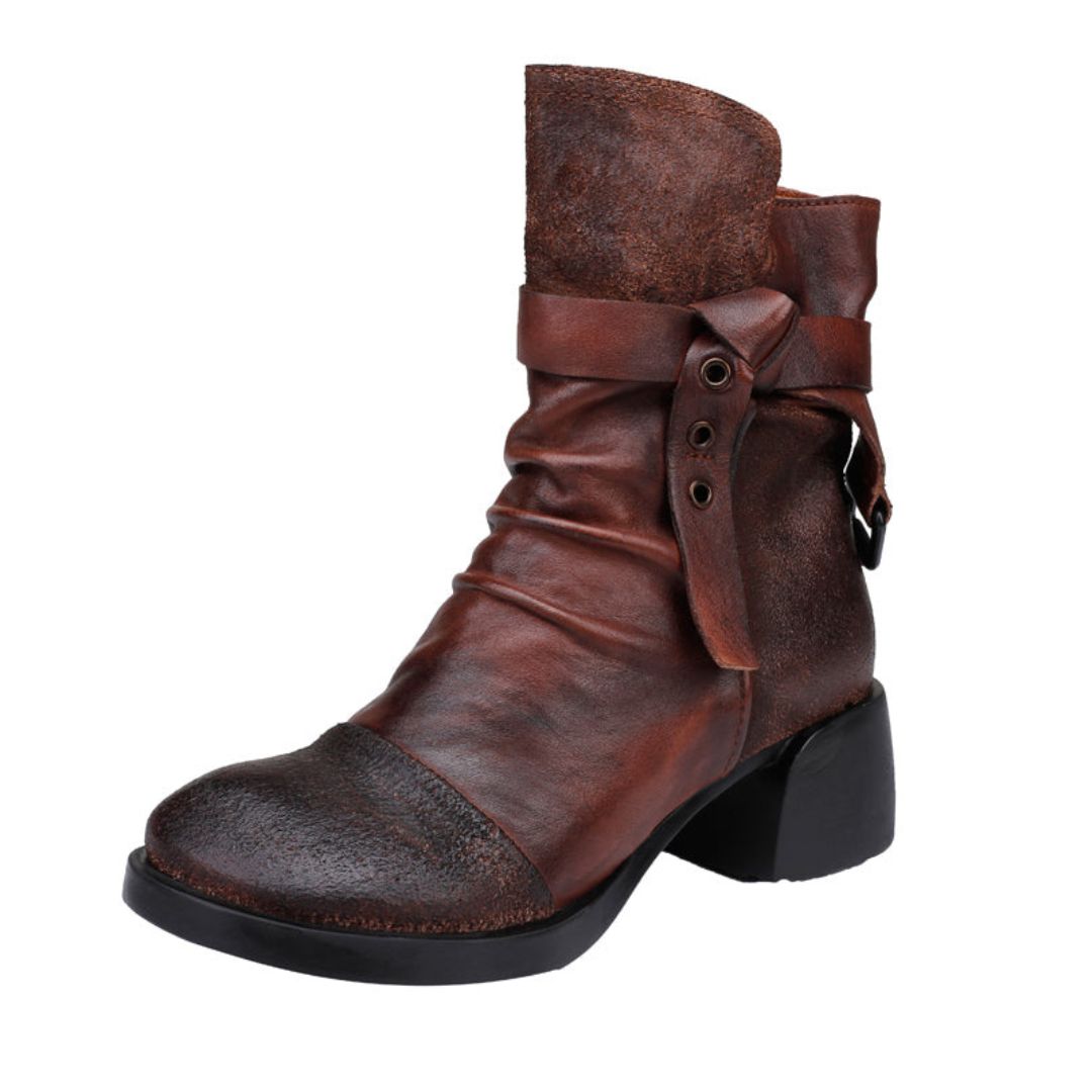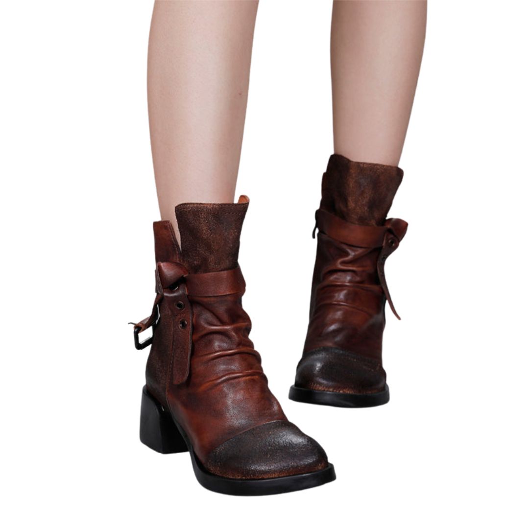 Bottes Femme - Cuir Vintage - Talon Bloc Confort - Sangles et Boucles Décoratives par Revuna : Élégantes bottines en cuir au style vintage avec talon bloc confortable, rehaussées de sangles et boucles décoratives. Parfaites pour un look tendance et pratique au quotidien.